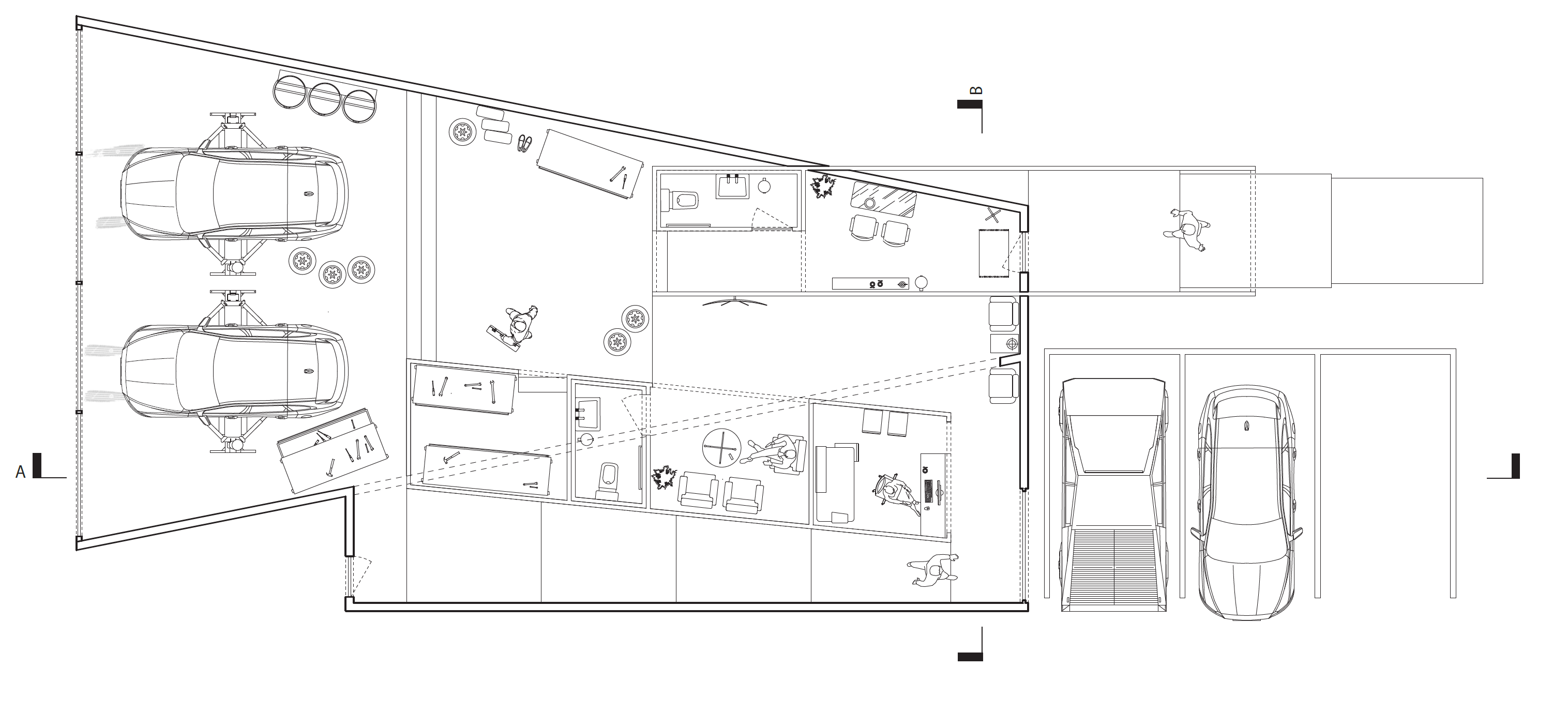 Firstly, two cone-like volumes produce a forced perspective, manipulating the perception of space to appear further. Tighter niches for an office and entry open toward large, open areas for the garage and car lifts.